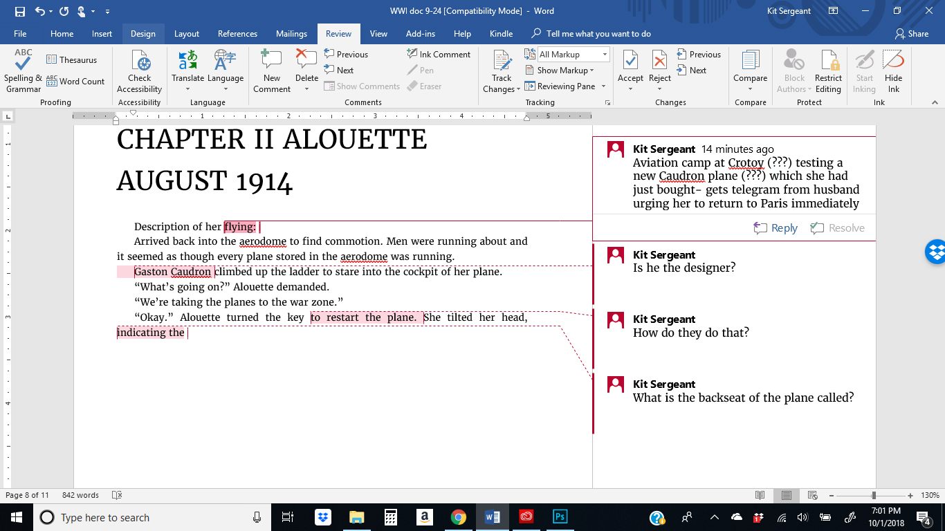 This is a screenshot of the first chapter of my current Work in Progress (WIP for writers in the know). As you can see, there’s a lot of details to be filled in. I’m writing a scene where one of my characters, Alouette, comes back from flying her plane to find that the war has began.
